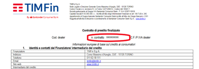 - Il numero di contratto/pratica è indicato all’interno di diverse documentazioni ricevute via e-mail ida TIMFin. Documentazioni come: copia contrattuale, lettera di conferma contratto oppure lettera di motivazione rifiuto/liberatoria.